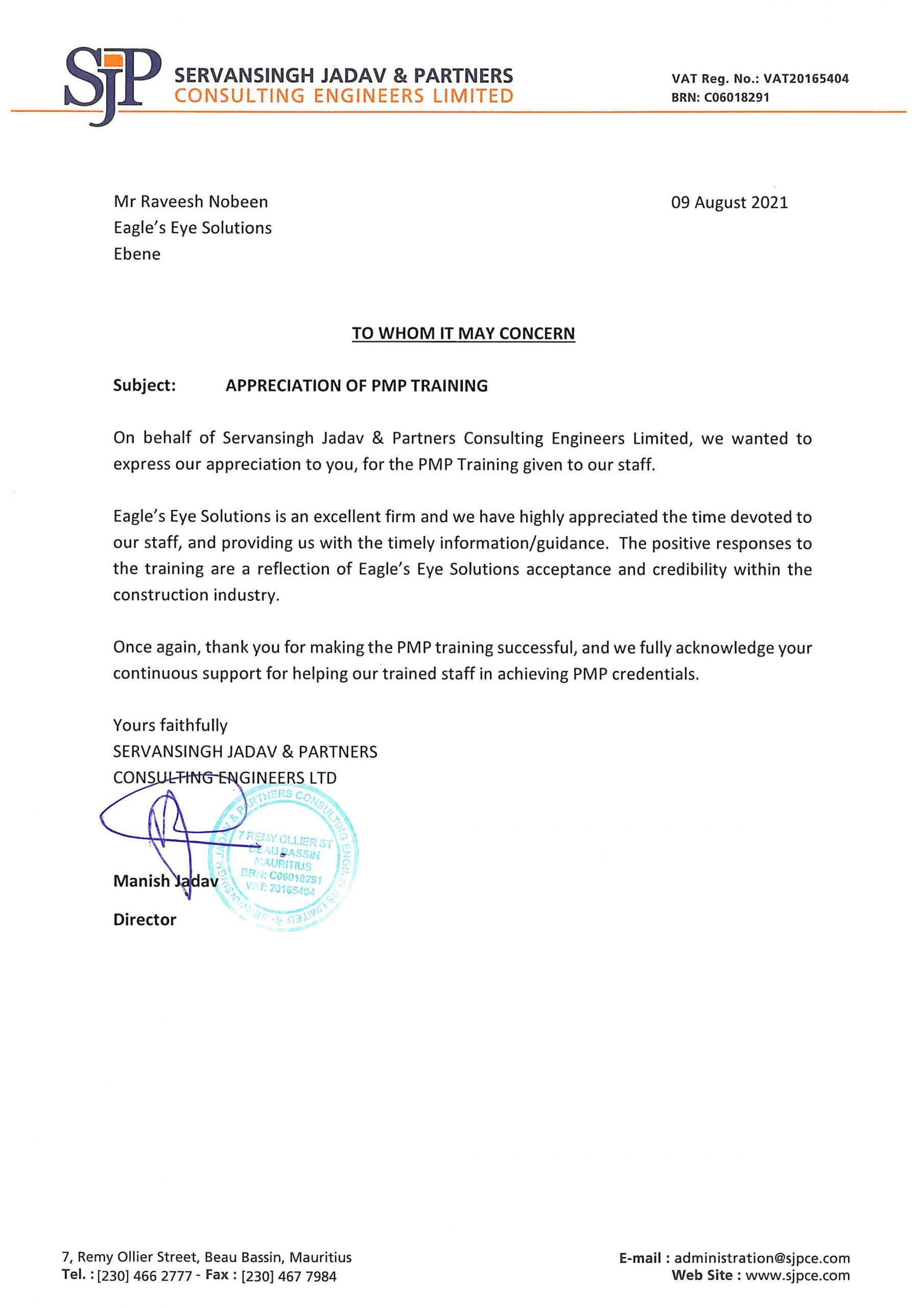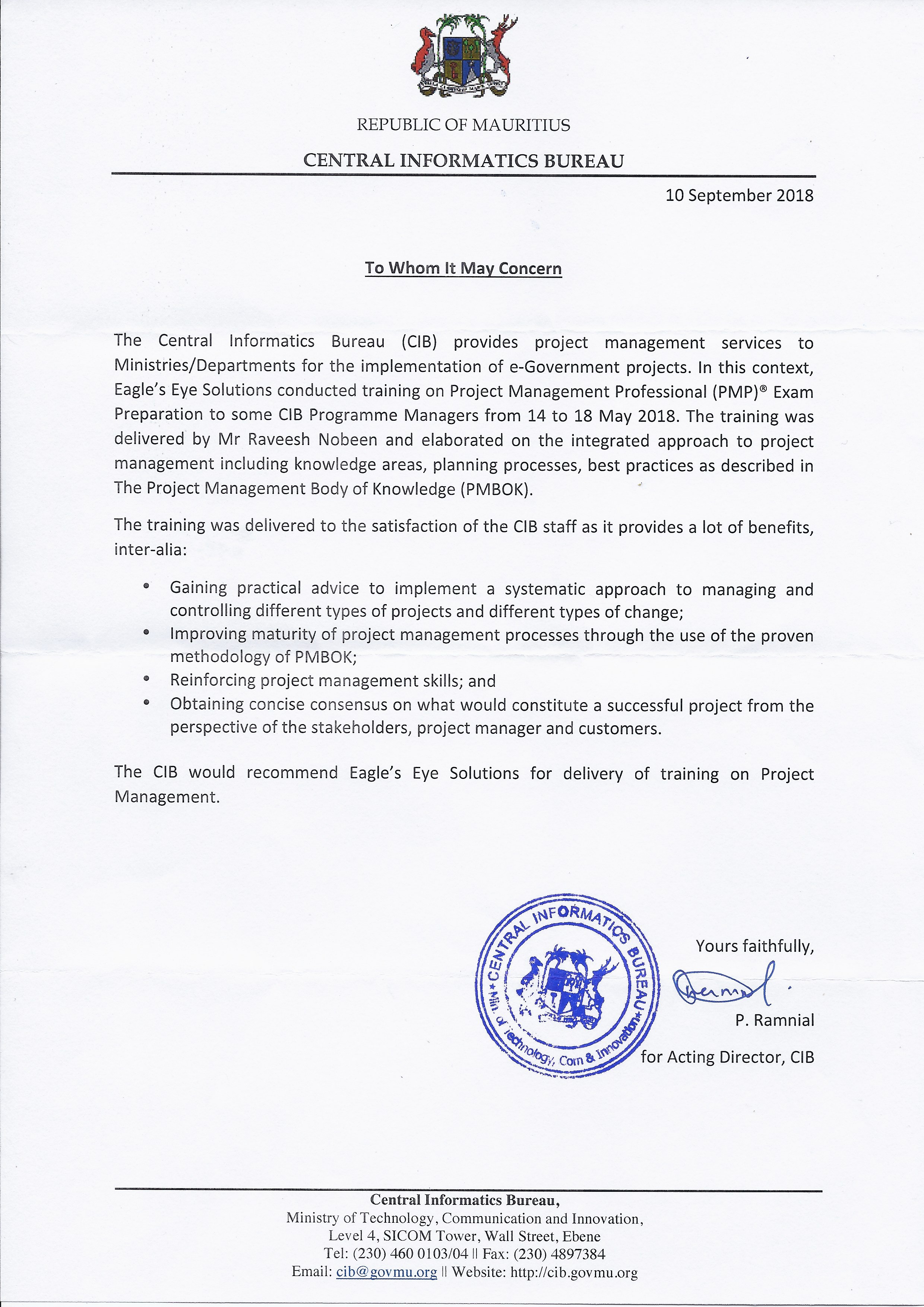 "I passed my PMP exams on first attempt. I would like to thank Mr Raveesh Nobeen for all the help, coaching and guidance he provided. He was always available to assist. I would strongly recommend anyone who wishes to undertake the PMP exams, to go for the preparatory exams course at Eagle's Eye Solutions. Thank you again."