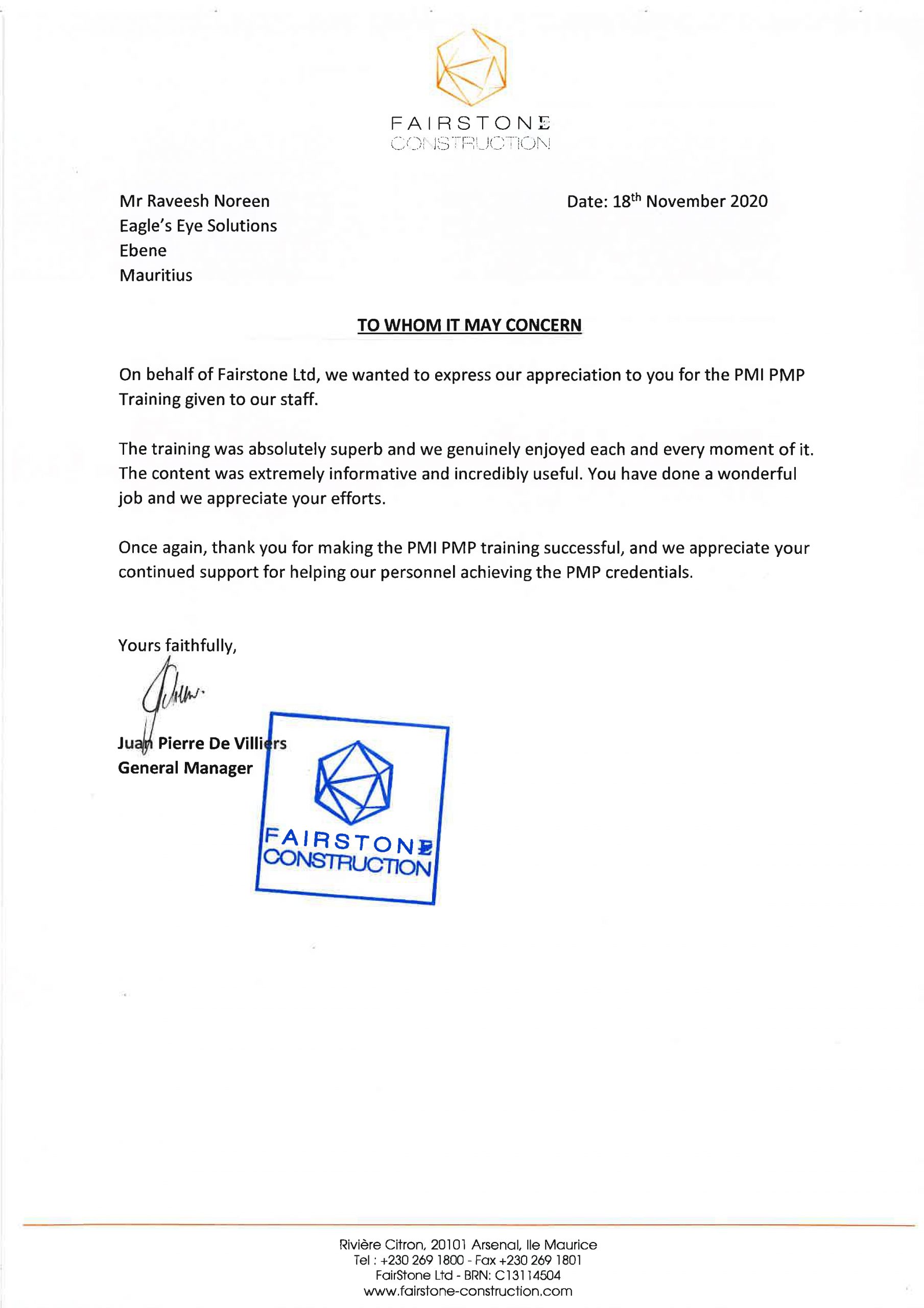 "Embarking on a PMP course with Eagle's Eye Solutions has turned out to be a good choice. The course, delivered by Mr Nobeen, has been clear, thorough and concise. It has offered valuable tools and materials to help me confront the PMP exam with much confidence. I therefore succeeded in obtaining the PMP certification at my very first attempt, about three months after enrolling with Eagle's Eye Solutions. During the preparatory stage, Mr Nobeen, has always been prompt in answering all my queries. He has proved to be an excellent guide, an outstanding communicator and great adviser. Many thanks for an excellent course. I would certainly recommend Eagle's Eye Solutions to anyone who is thinking of joining a PMP course."